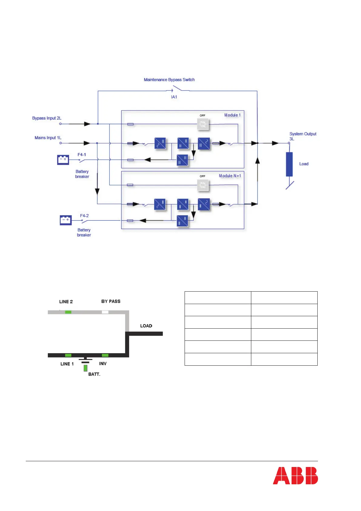 In on-line mode, the load is connected to the inverter (INV) and the rectifier (Line1) is supplied by the