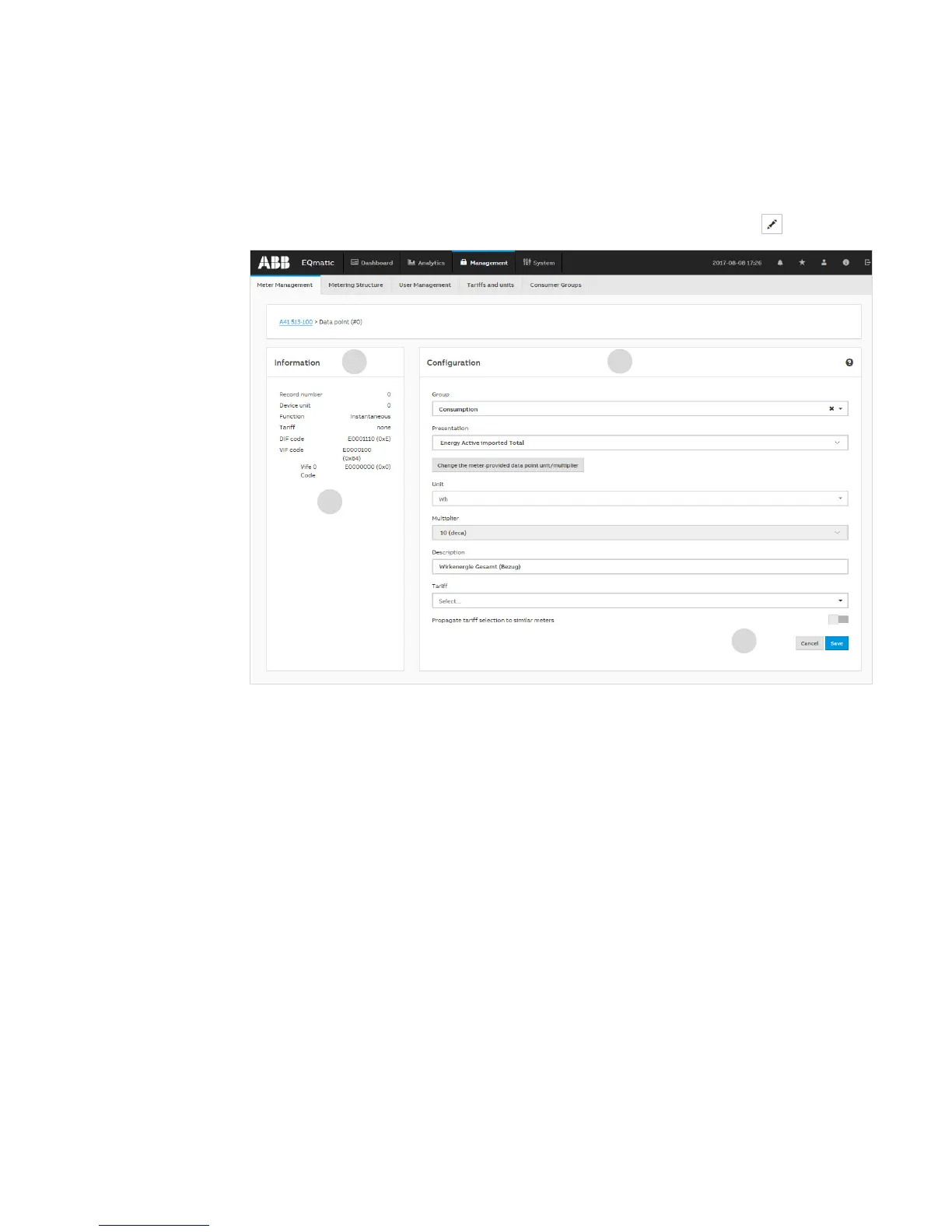 Type, Unit, Multiplier, Description and Tariff). Click Save (4) to apply the settings. The data point is