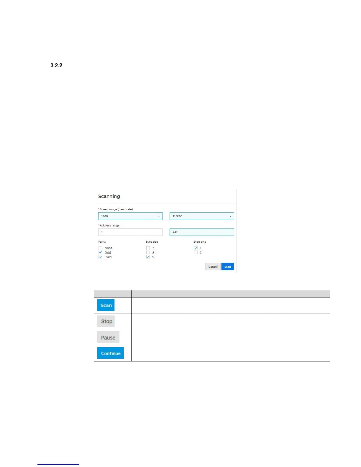 To scan the bus for meters connected, you must first set the speed range (speed), address range,