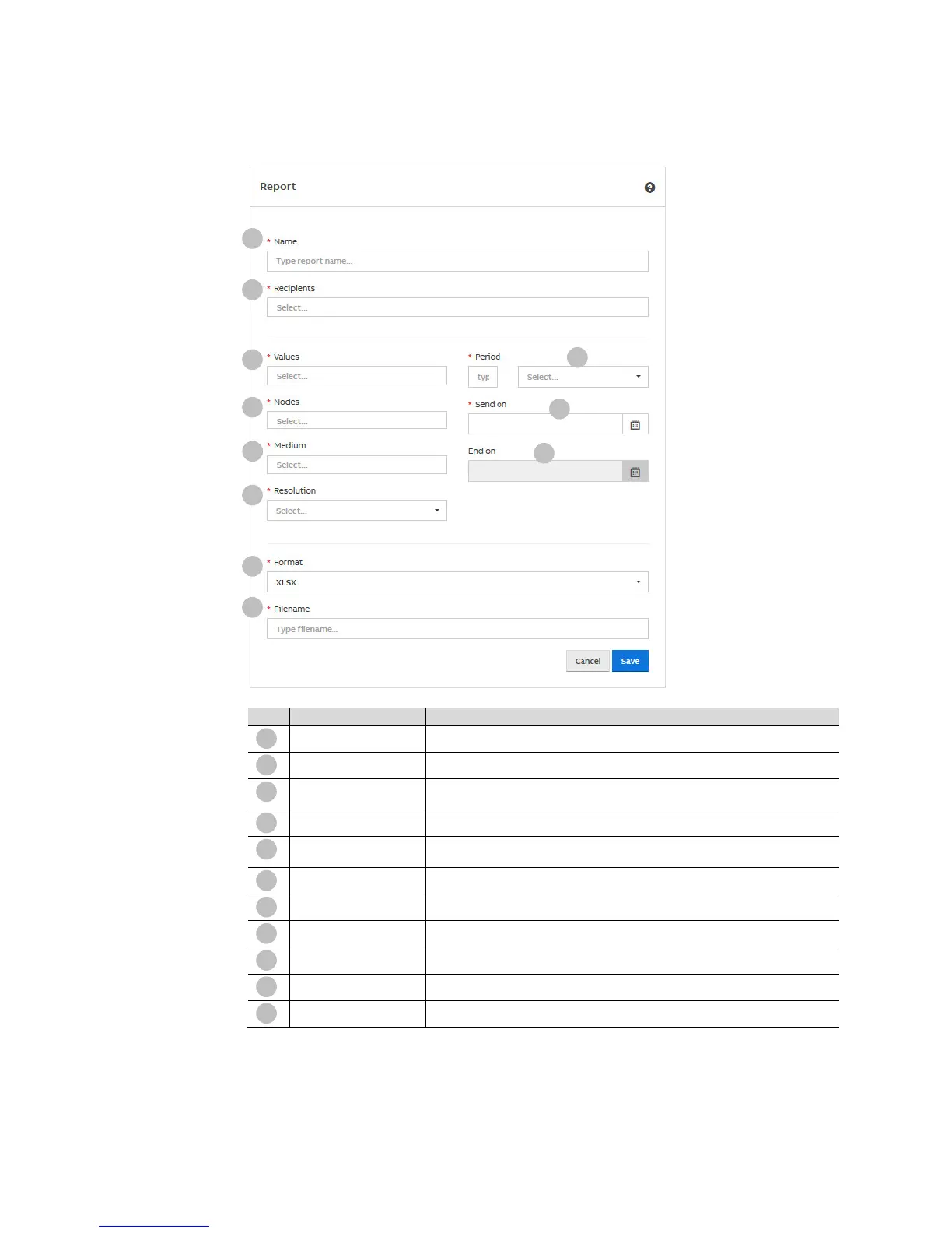 Used to select the file format for the report (e.g. XLSX, CSV, etc.)