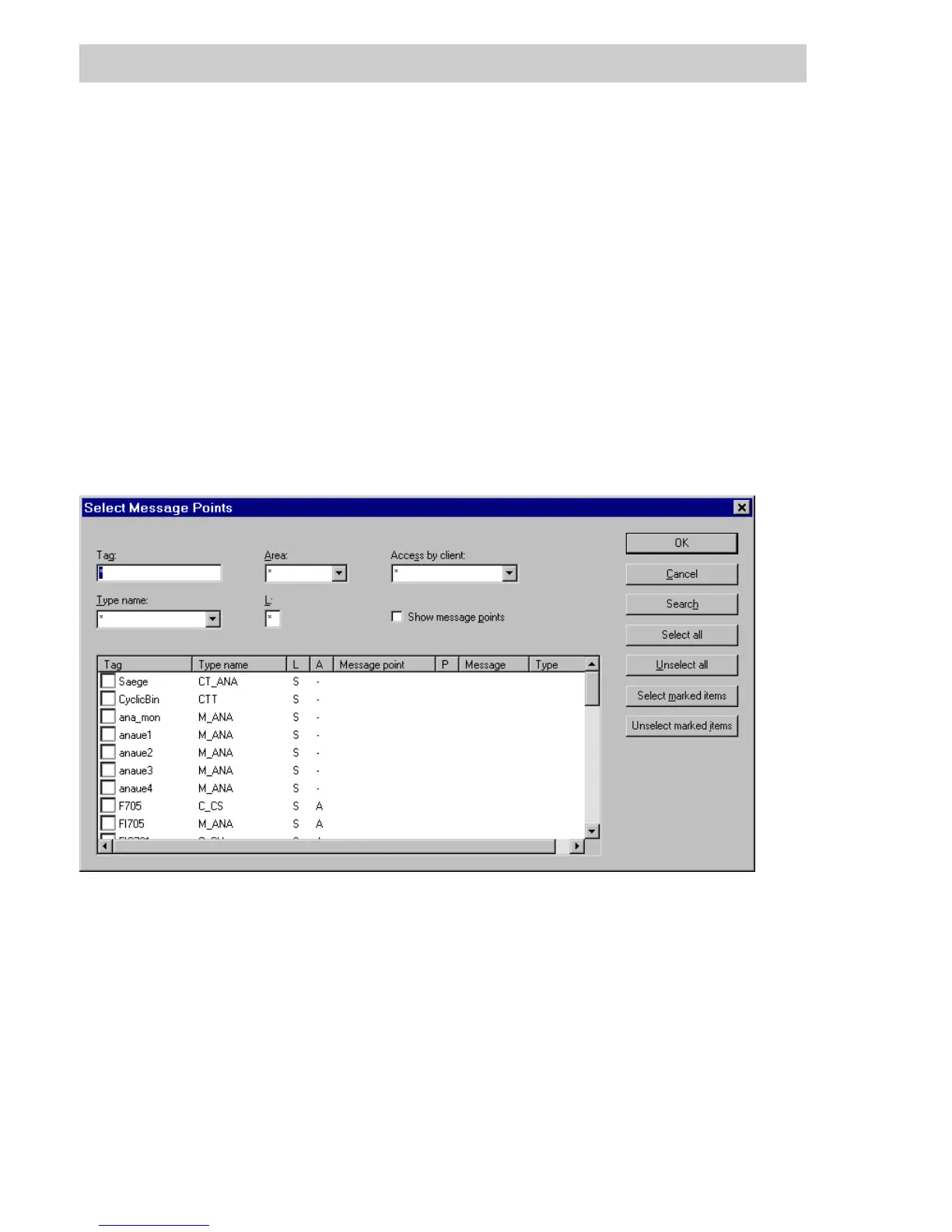 All allocated tags in the project that have a faceplate and at least one message point are listed.