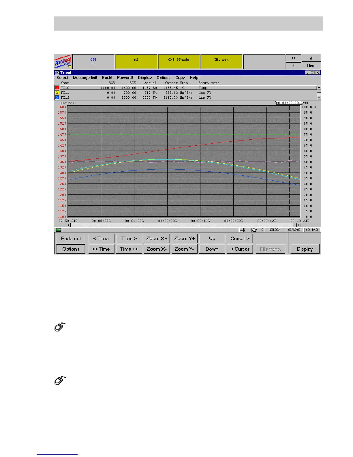 A trend display is called and edited in the project tree beneath a resource operator station; for a