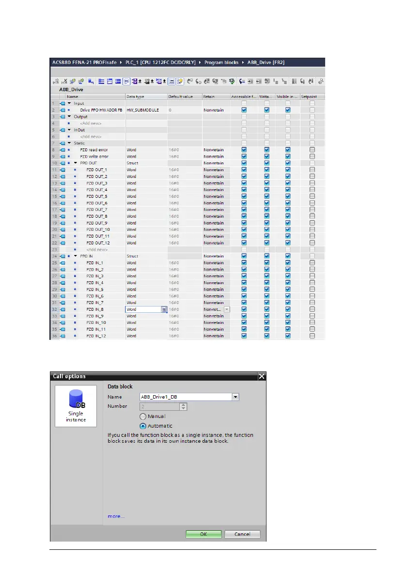 18. Add ABB_Drive FB to OB1. Assign new instance Data Block for ABB_Drive FB.