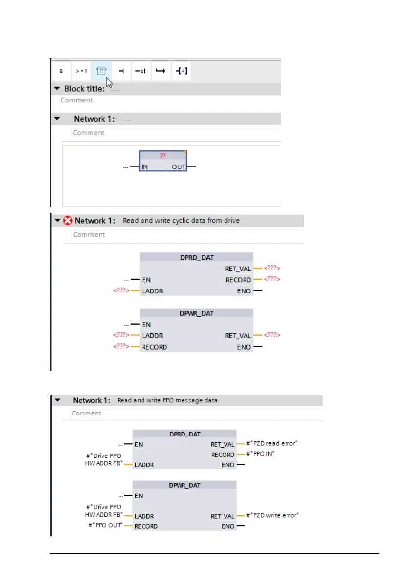 20. In ABB_Drive FB, add blocks DPRD_DAT and DPWR_DAT.