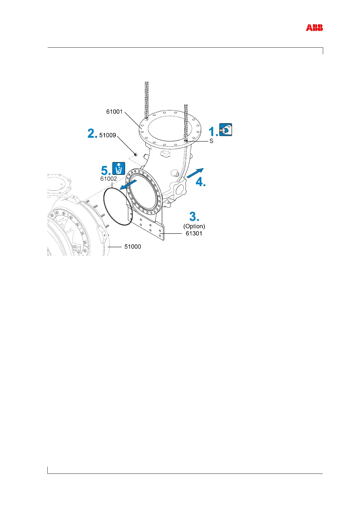 1. Fit swivel lifting eyes (S) to the gas outlet casing (61001). Secure lifting gear to the swivel