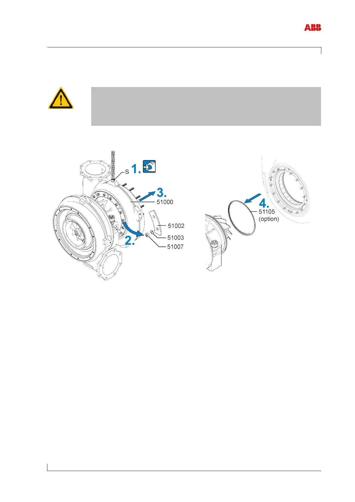 1. Fit swivel lifting eye (S) to the turbine casing (51000). Secure lifting gear to the swivel lift-