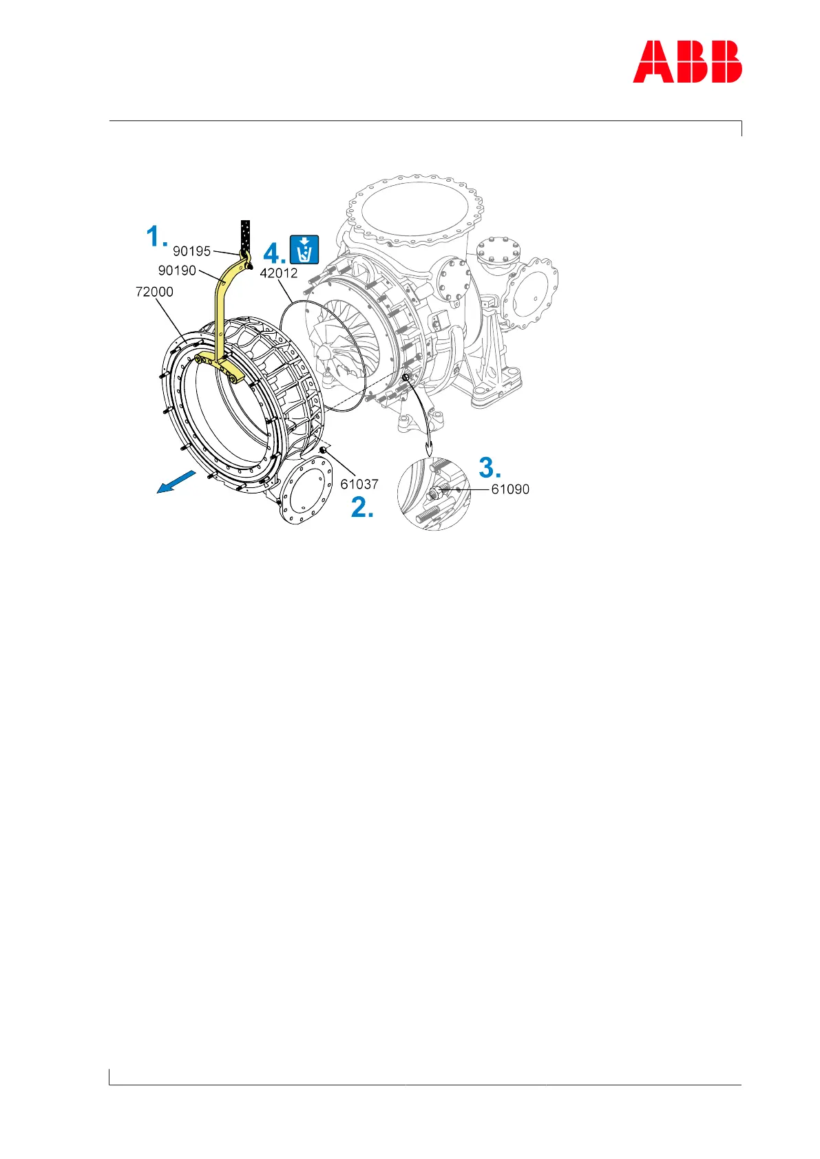 1. Using shackle (90195) and lifting gear, fasten lifting device (90190) to compressor casing