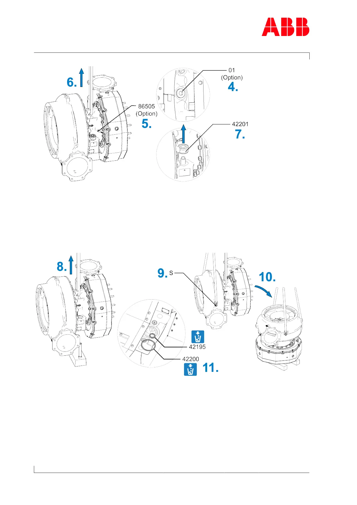 ABB HT601346 - Fig. 55: Removing the Cartridge Group with Compressor and Turbine Casing; Fig. 56: Set down the Cartridge Group with the Compressor and Turbine Casing