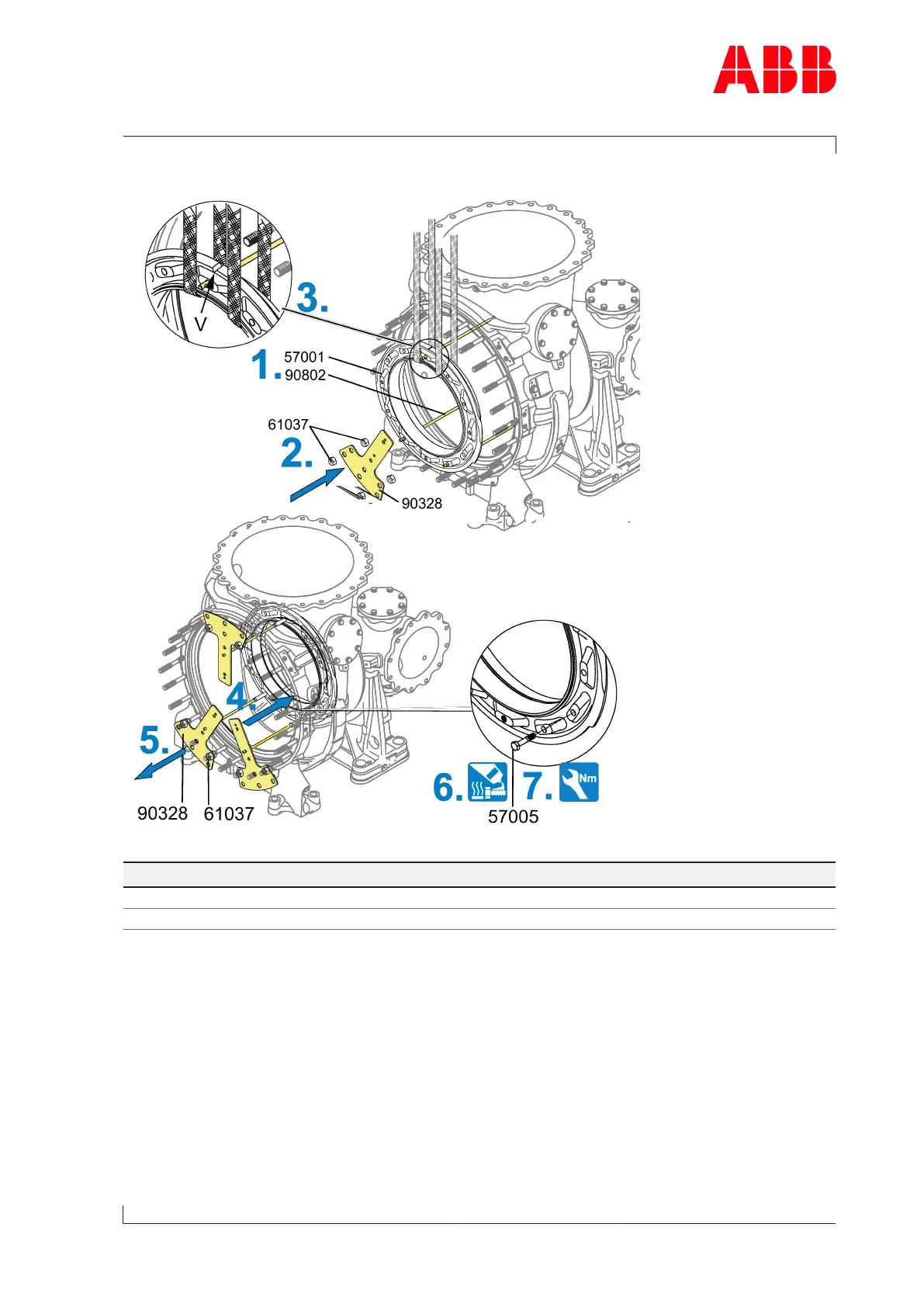 1. Using lifting gear, move in cover ring (57001) over guide studs (90802) with notch (V) fa-