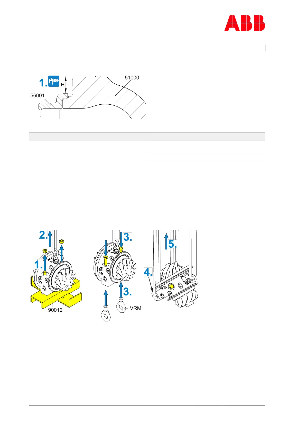 ABB HT610703 - Fig. 50: Measuring the End Position of the Nozzle Ring; Fig. 51: Lifting the Cartridge Group and Rotating It by 90; Installing the Cartridge Group; Table 38: End Position of the Nozzle Ring, Control Dimension H