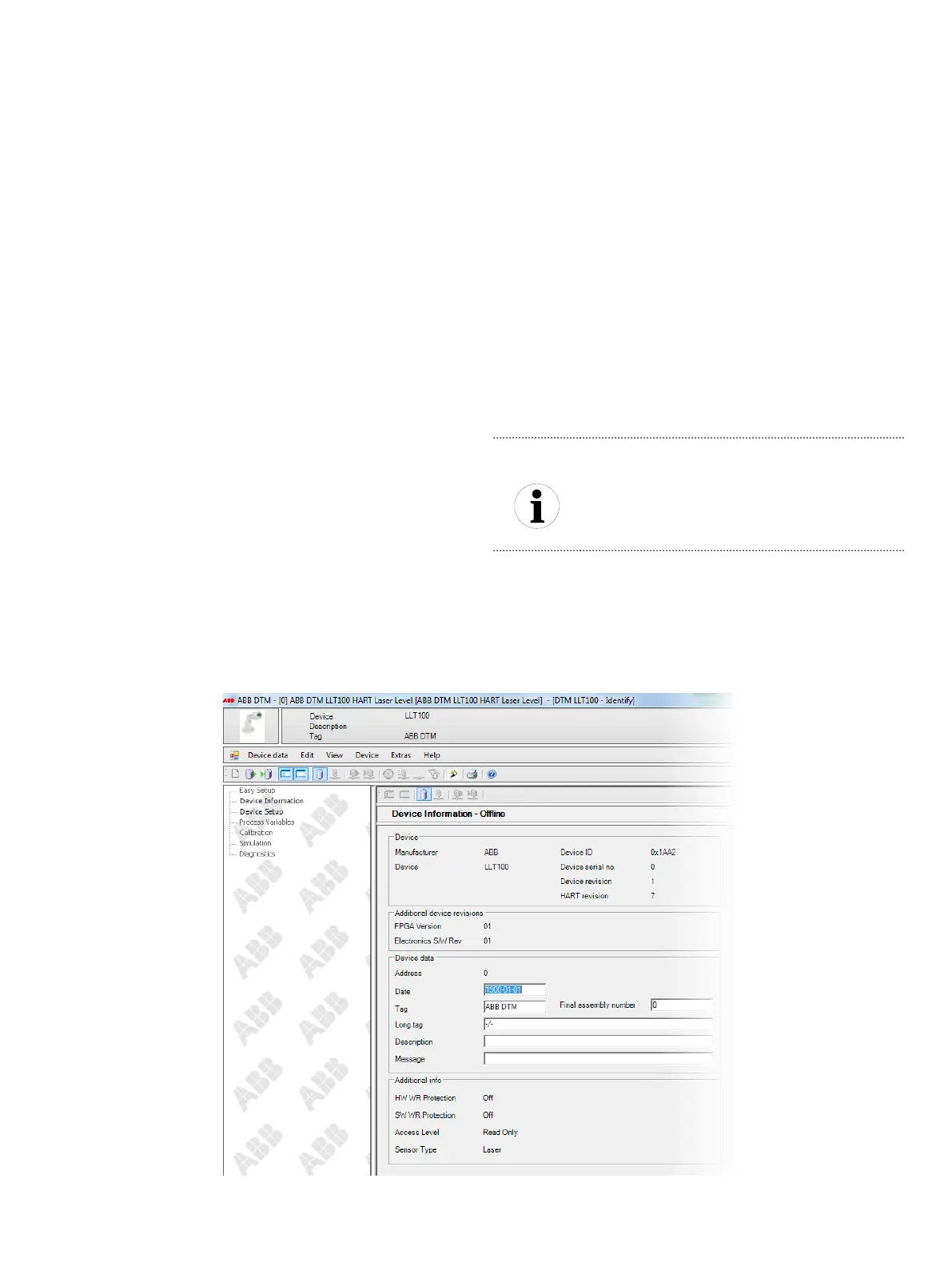 Figure 14 Typical DTM (HART) screen for the LLT100