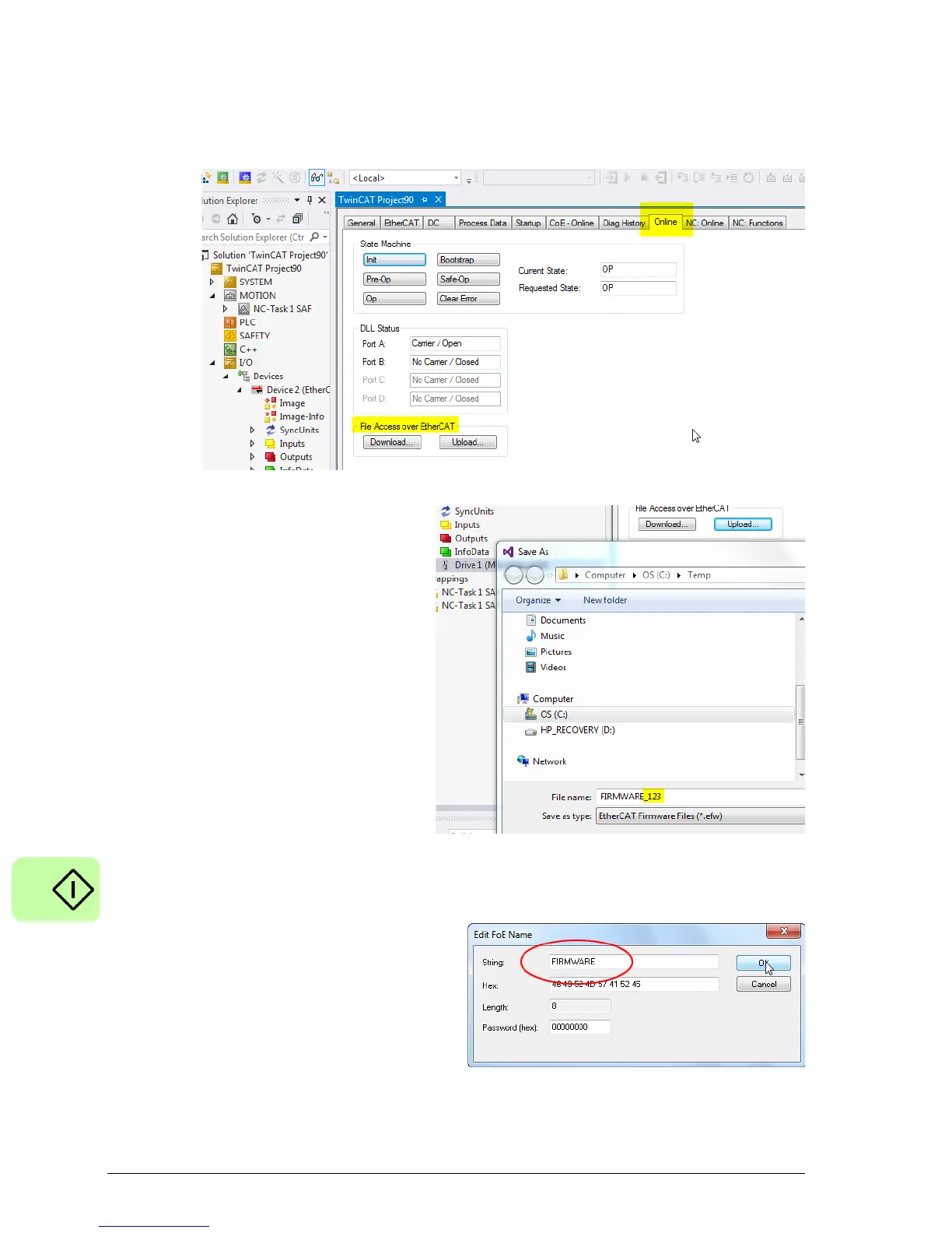 9. Under File Access over EtherCAT, click Upload… to upload one of the firmware