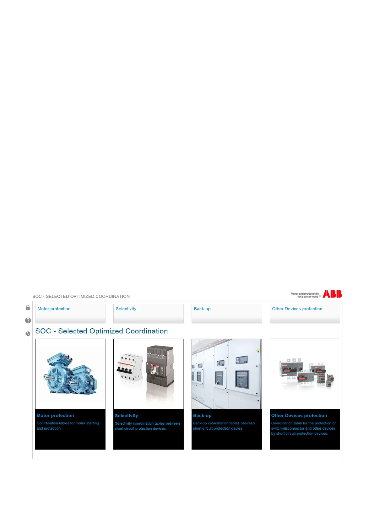 As a help to select the right ABB product for the application, the “Selected Optimized Coordination” (SOC) web tool