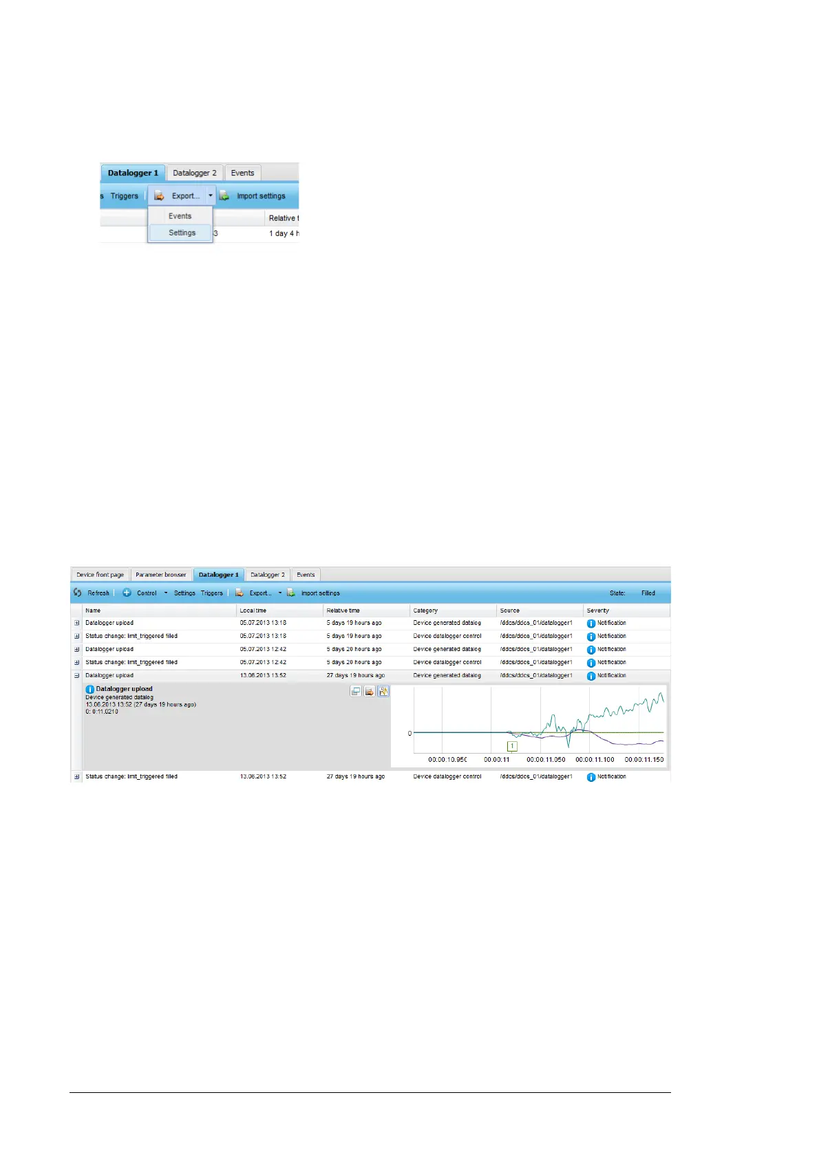 • Export… button shows a drop-down list of two options: Events and Settings.