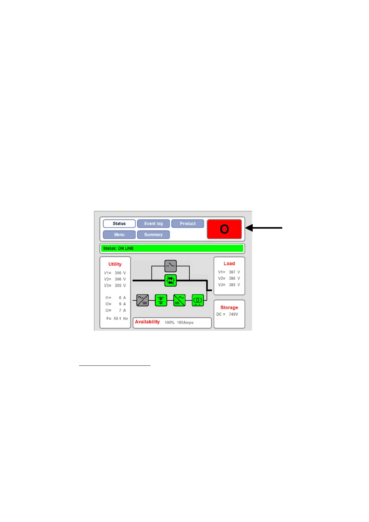 When the PCS100 UPS-I is stopped (Bypass) a green Start (I) button will show, and when running (RUN) a red Stop