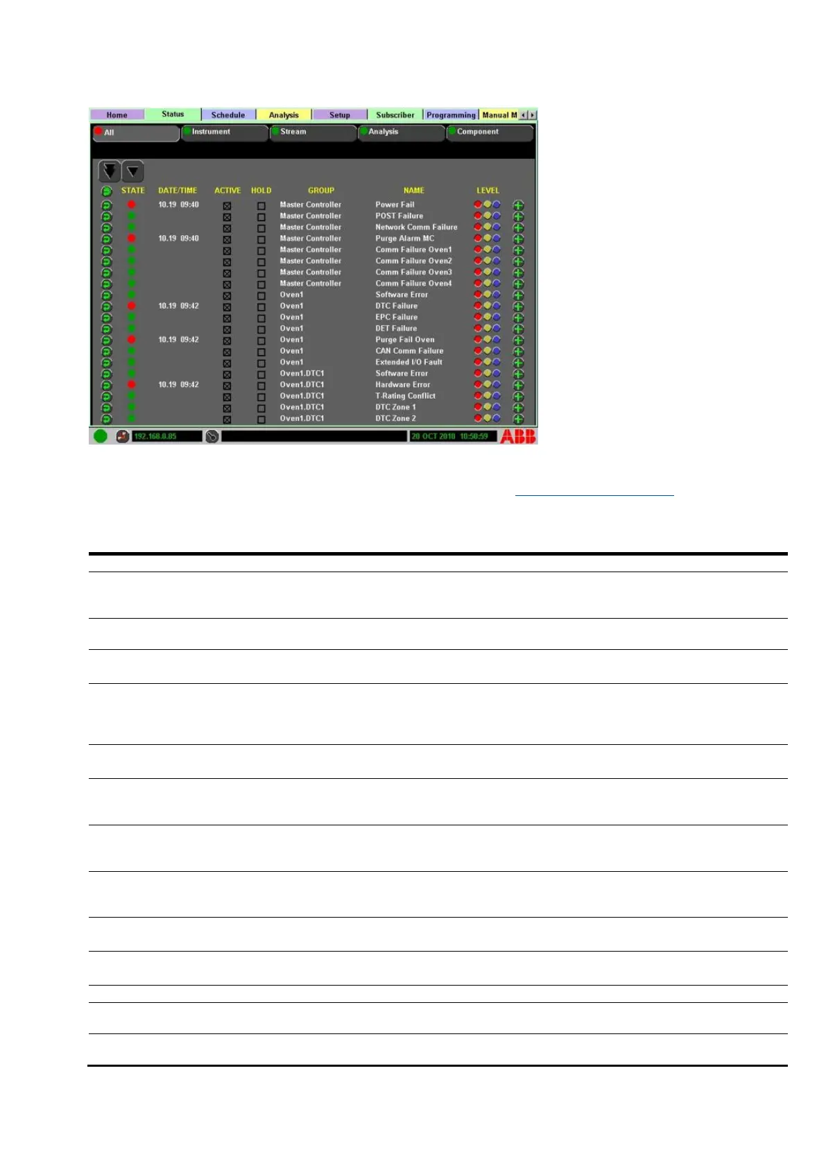 The Status indicator table below lists all available indicators under the Status tab>All subtab. The