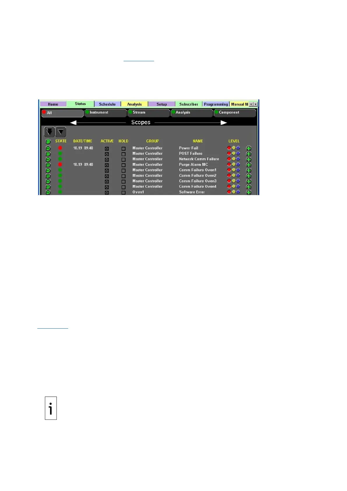 • Oven Sub-scope: Any active, triggered, alarm-level indicator activates the common