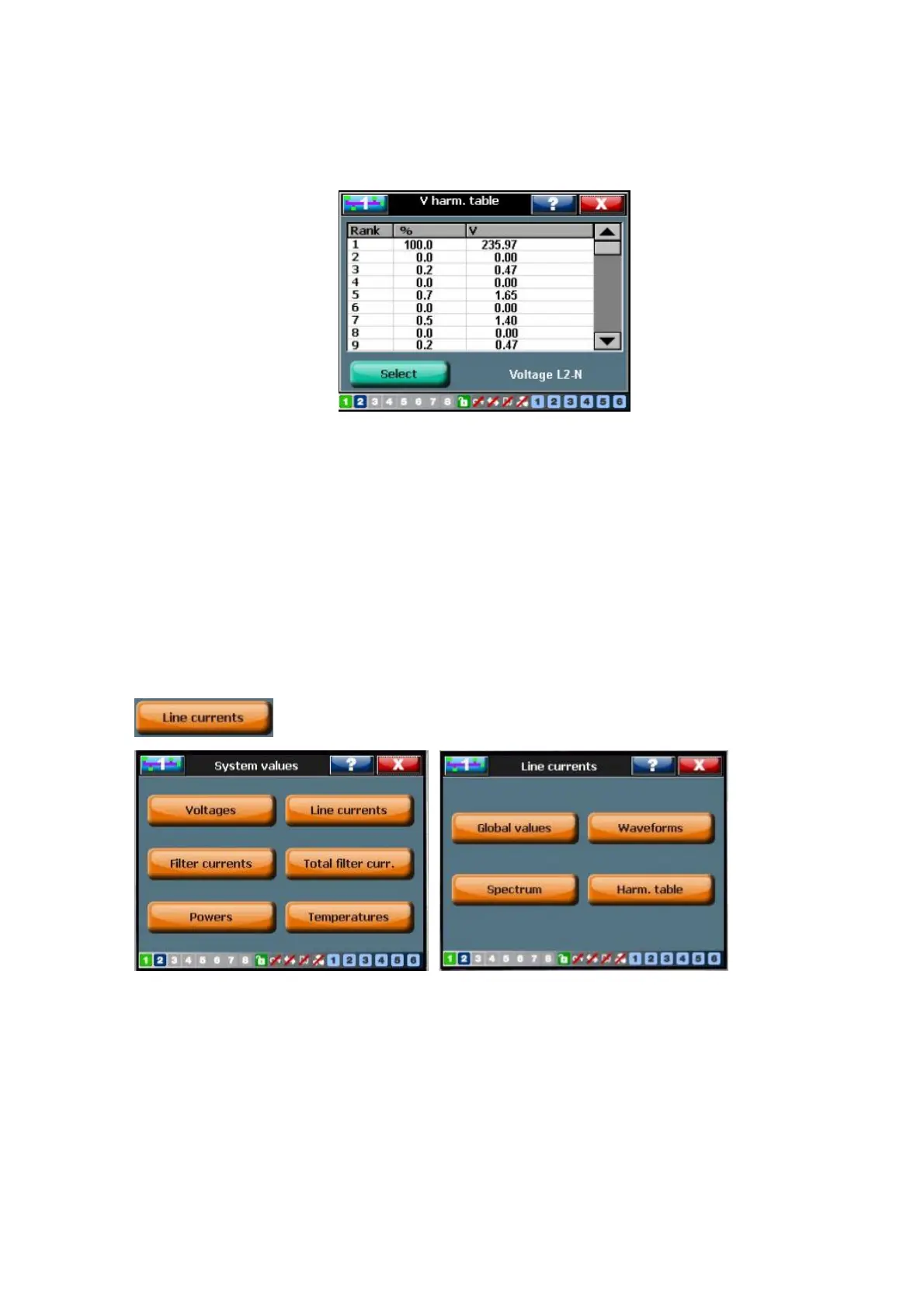 The network voltage spectrum for all phases in table format (Figure 80). Both the
