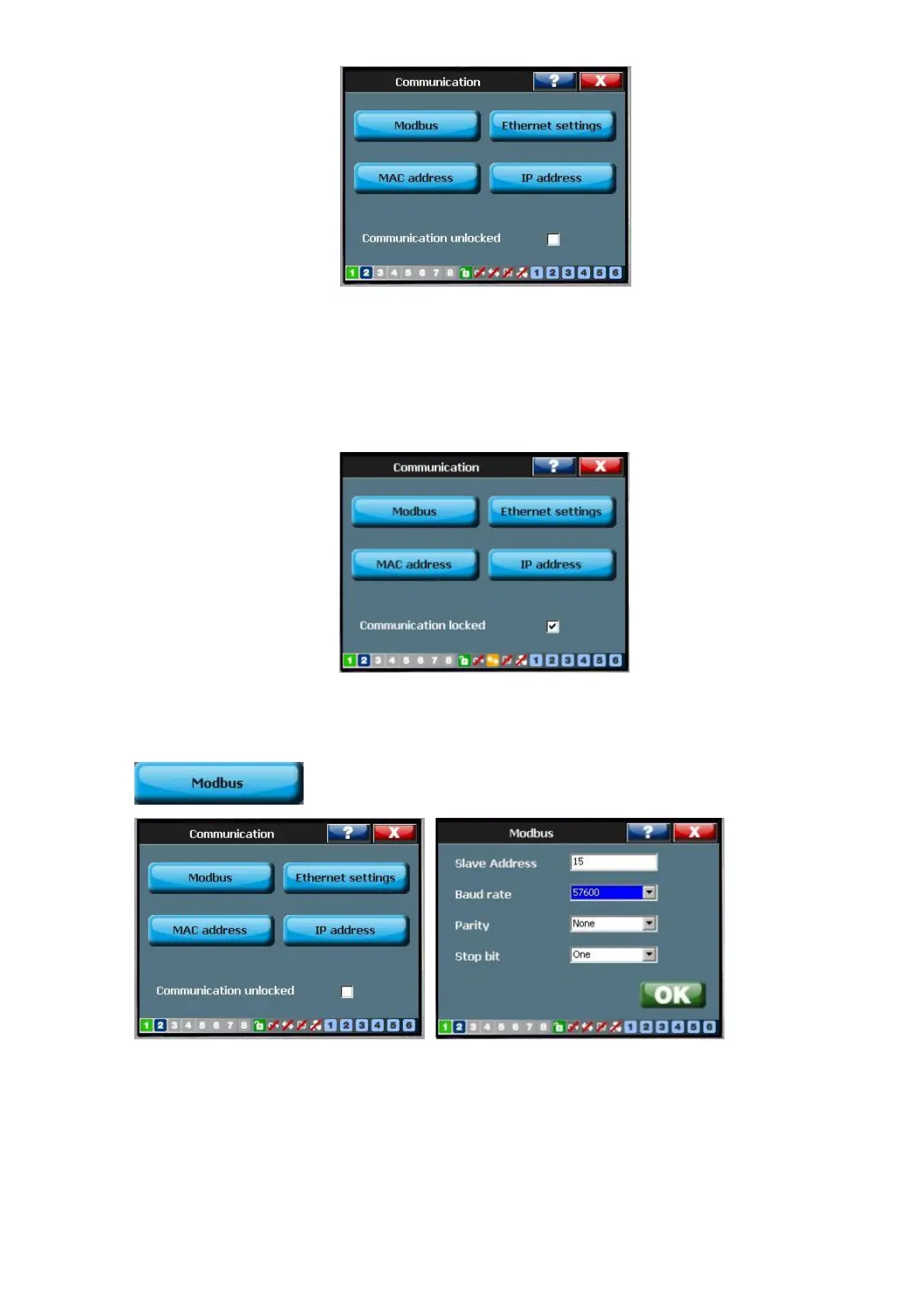 Baud rate, Parity, Stop bit shall match exactly the communication settings of the