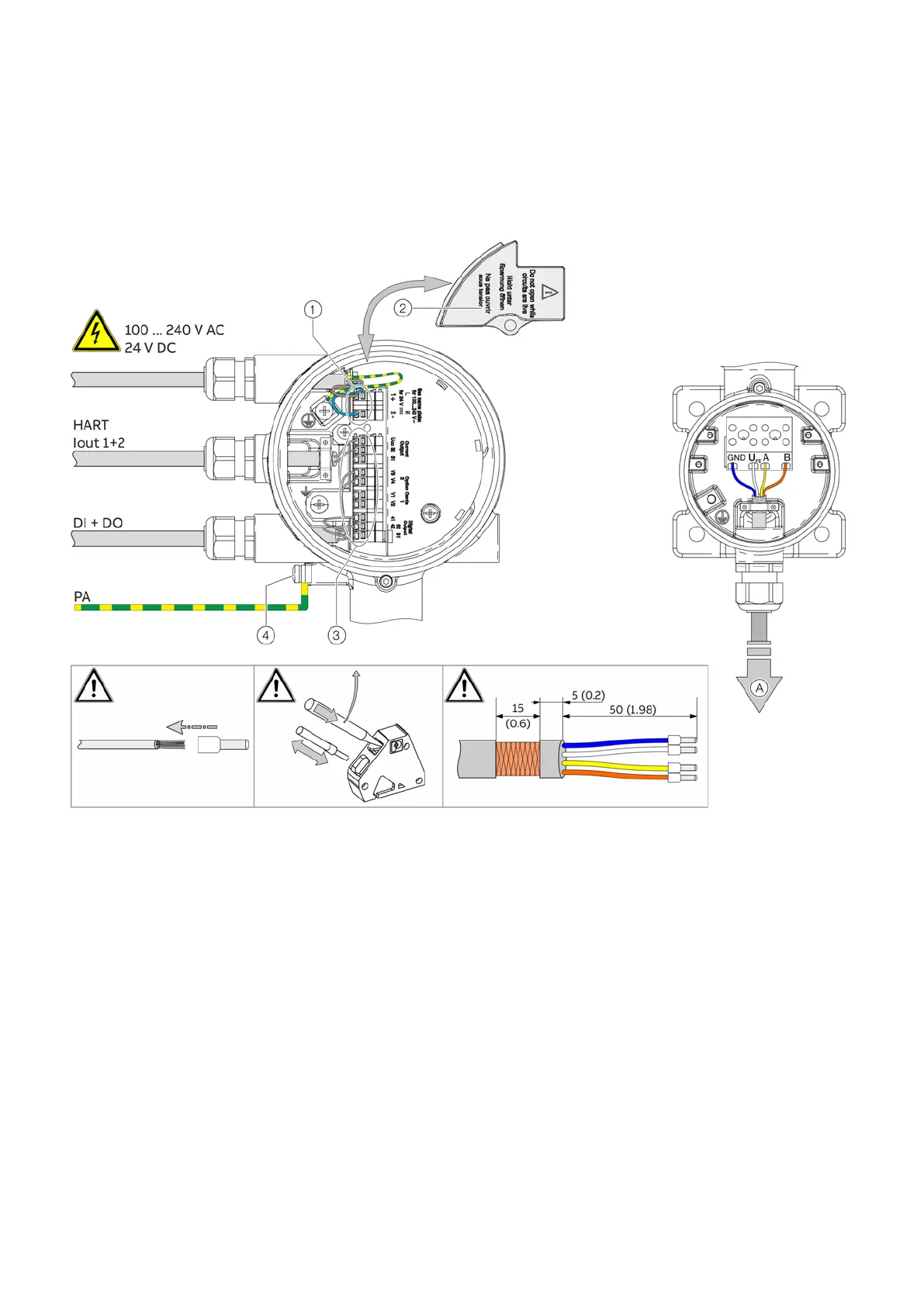 Figure 55 Electrical connection to transmitter in remote mount design [example, dimensions in mm (in)]