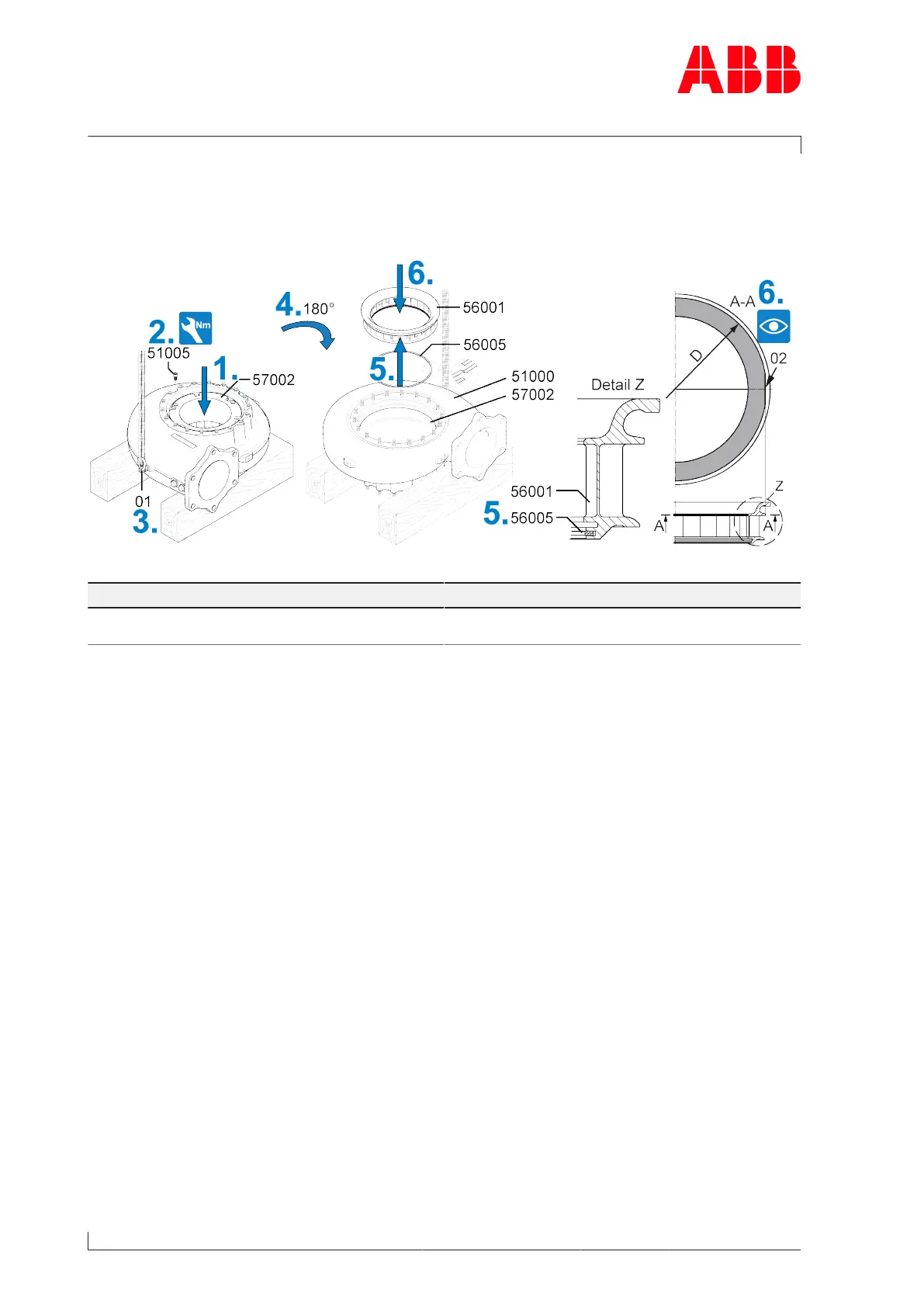 1. Install the gas outlet flange(57002) with the screws(51005) in the turbine cas-