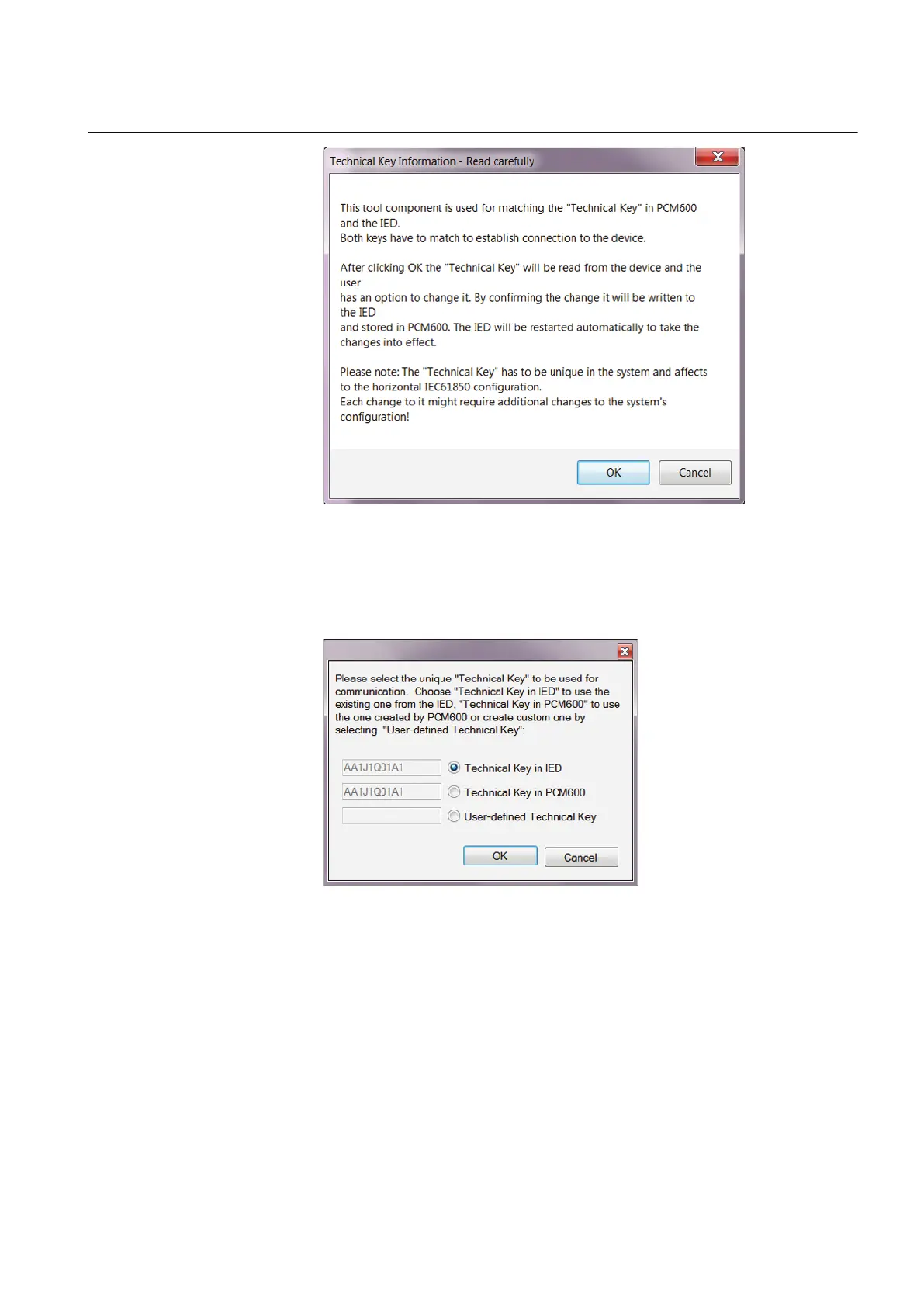 The technical key is read from the IED and the Set Technical Key dialog box