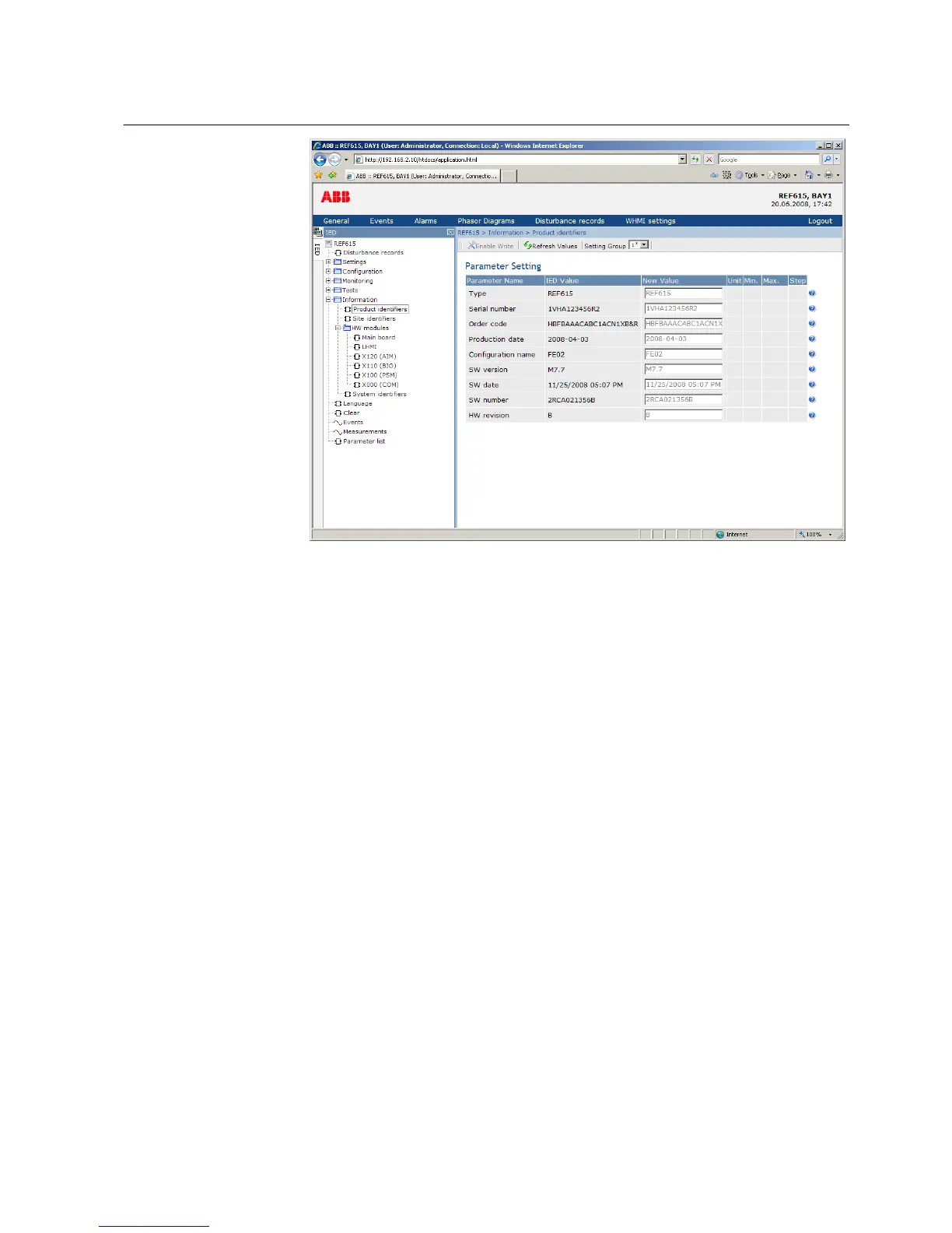 • The General view shows the IED version and status.