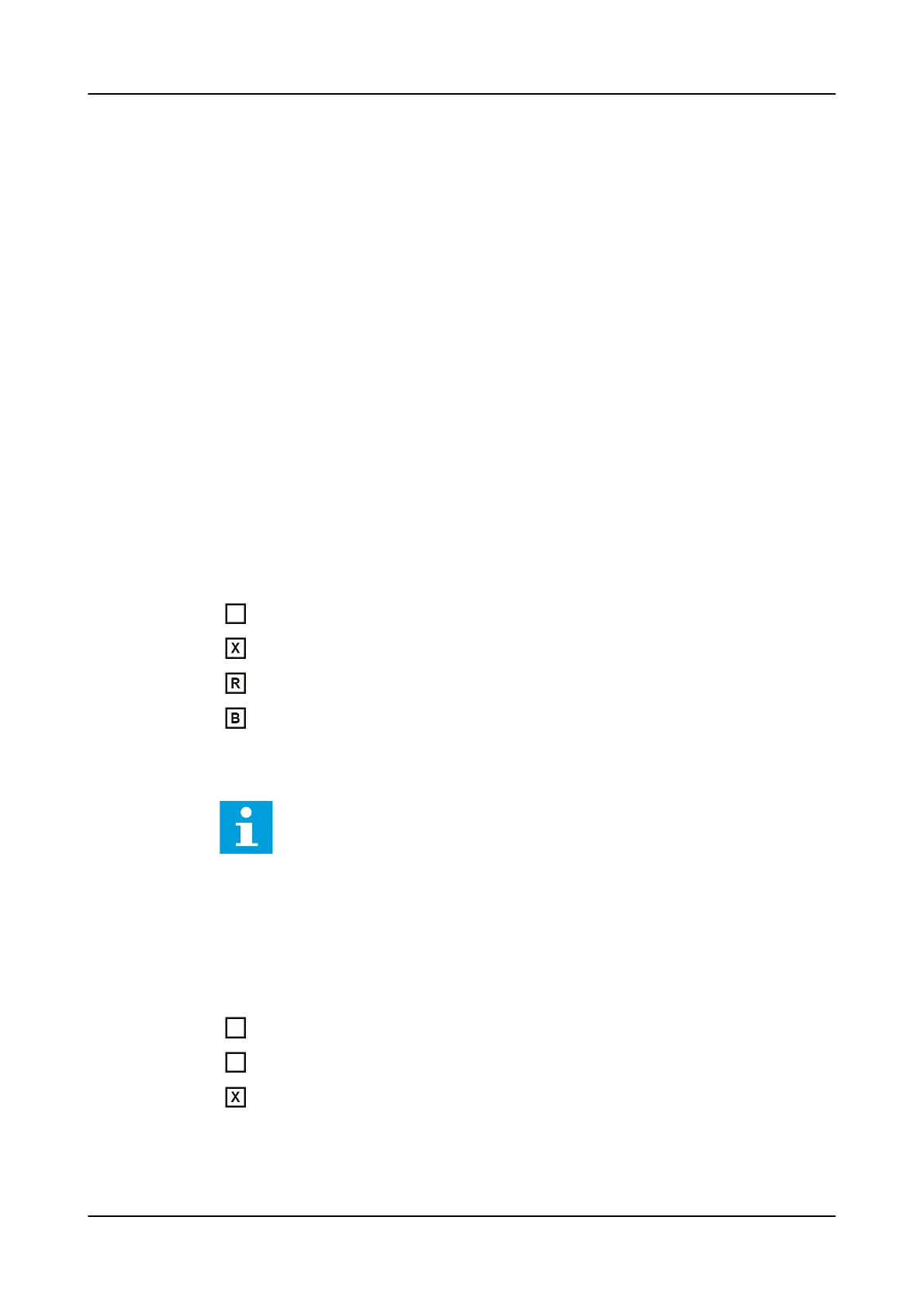 The possible selection (blank, X, R, or B) is specified for each specific clause or