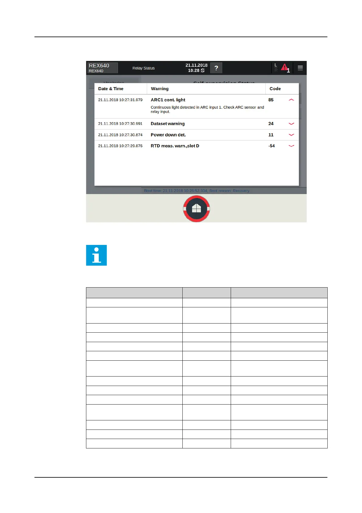 Table 10: Warning indications and codes