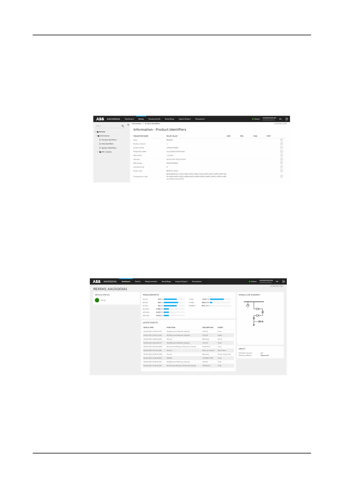 an overview of the protection relay including, for example, the device status,
