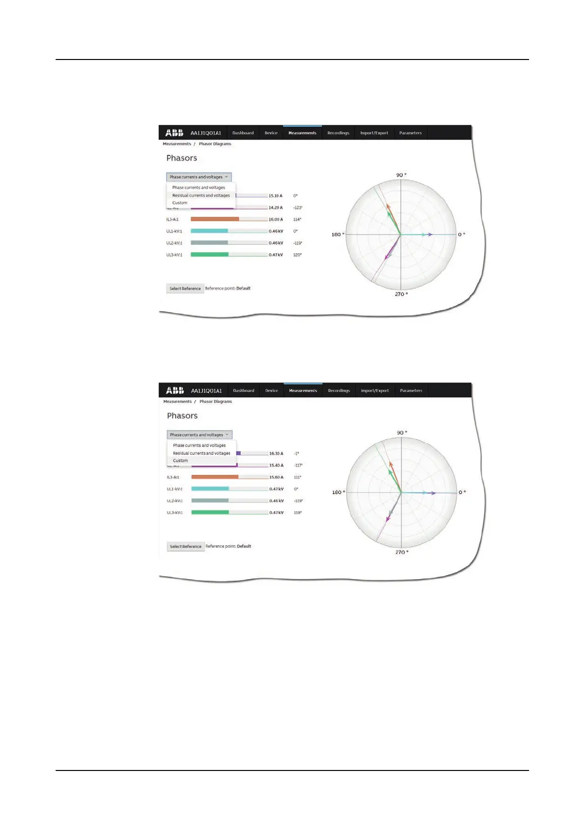 3. Select the phasor from the drop-down list on the Phasor Diagrams page to view