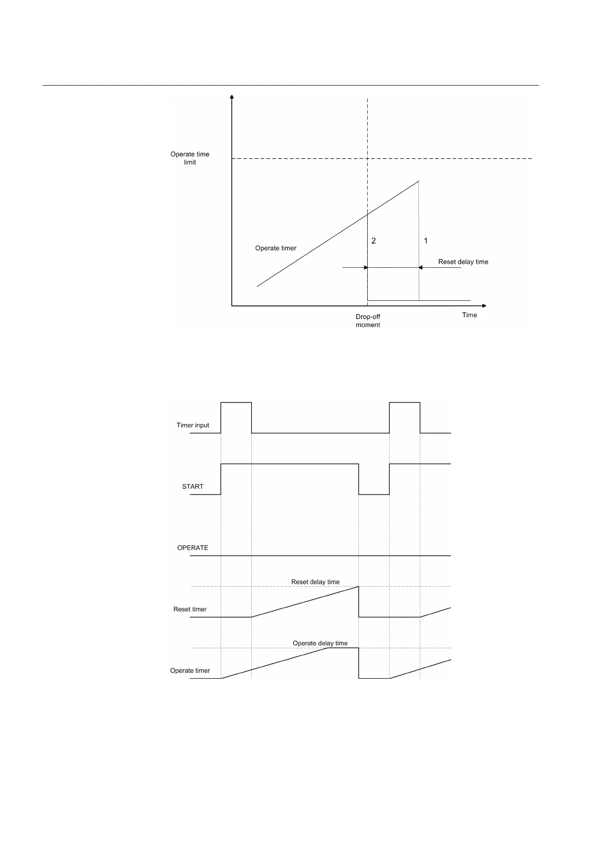In case 1, the reset is delayed with the Reset delay time setting and in case 2, the
