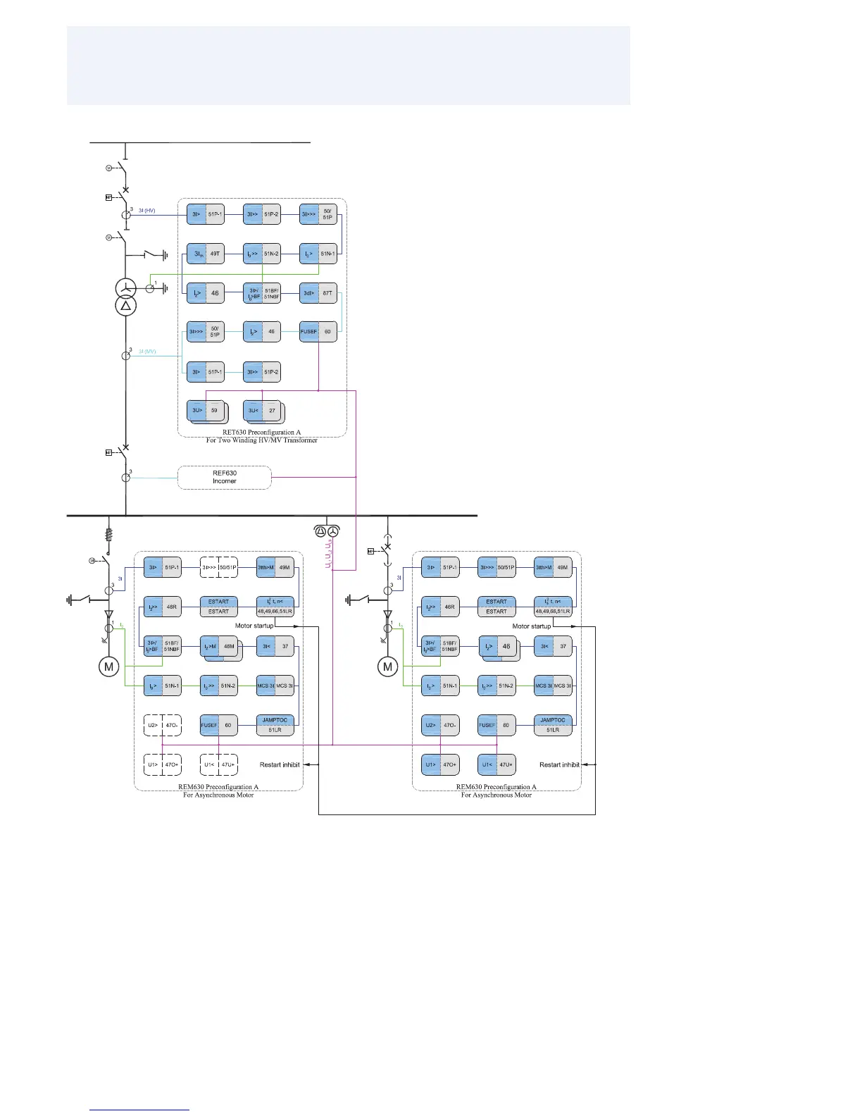 feeders. The motor start-up signal from each REM630 is connected to the “Restart