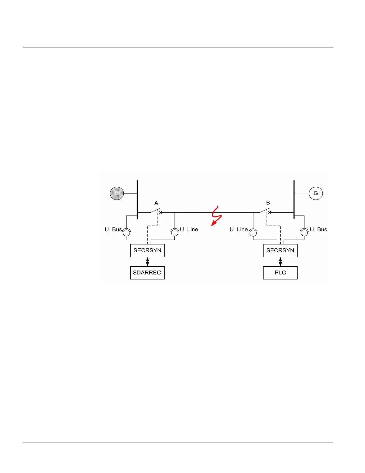 synch-check function controlling the circuit breaker B performs a synch-check and, if the