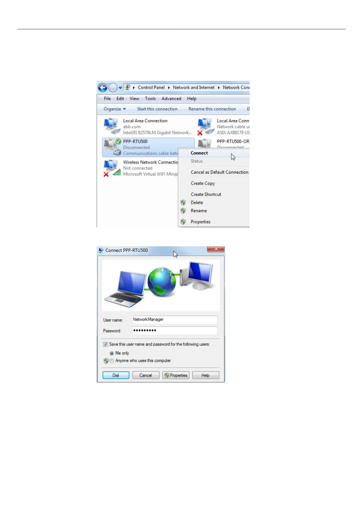 If authentication is configured in the RTU enter User name and Password and click Dial.