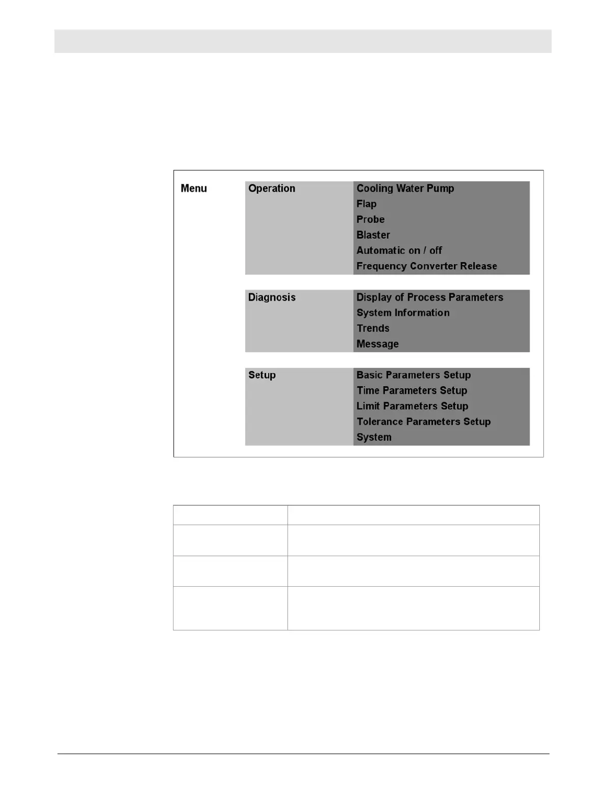 The following diagram depicts the menu structure. Only the first two of a