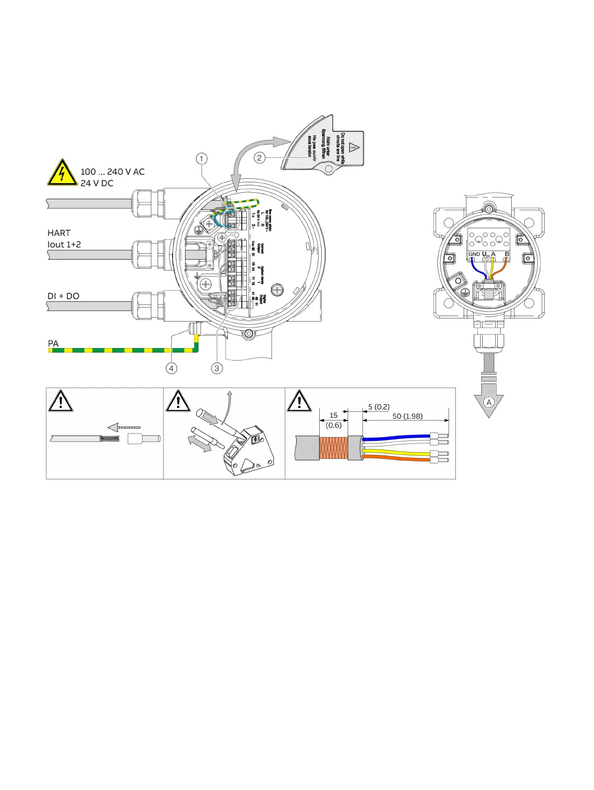 Figure 60: Electrical connection to transmitter in remote mount design [example, dimensions in mm (in)]