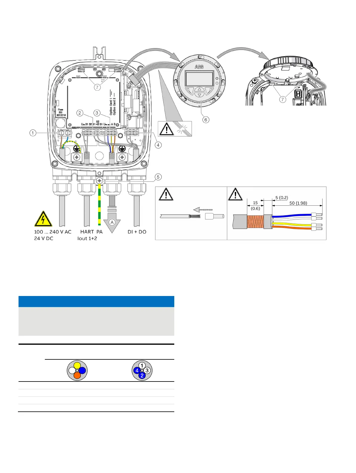 Figure 61: Electrical connection to transmitter in remote mount design [example, dimensions in mm (in)]