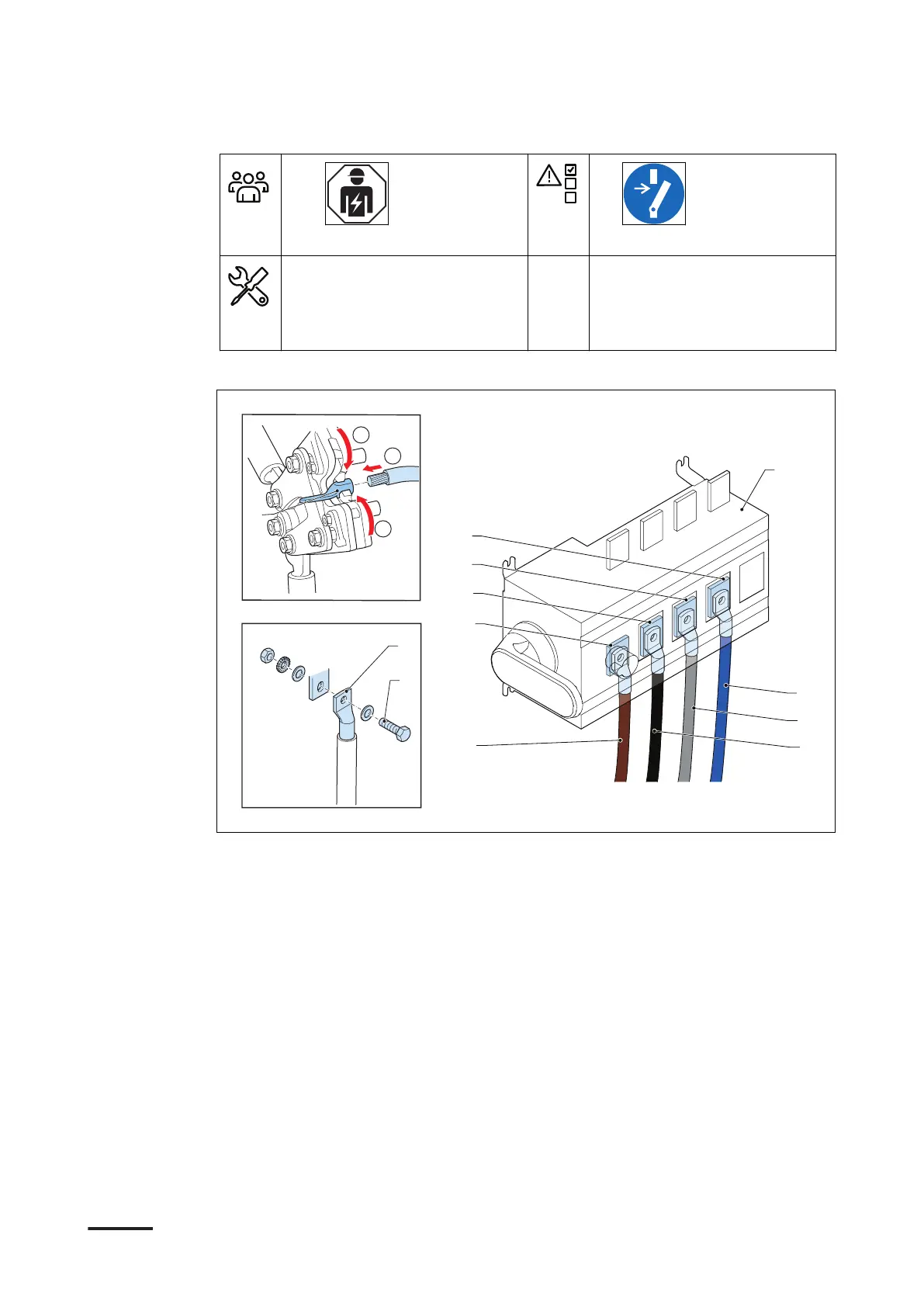 b. Attach the cable lugs (F) to the end of the wires. Use the crimp plier tool.