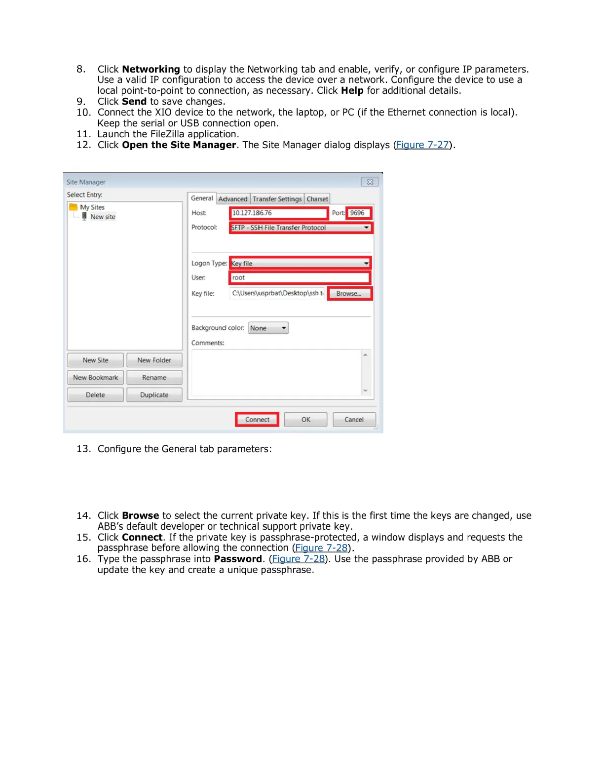 Figure 7-27: FileZilla Site Manager connection setup