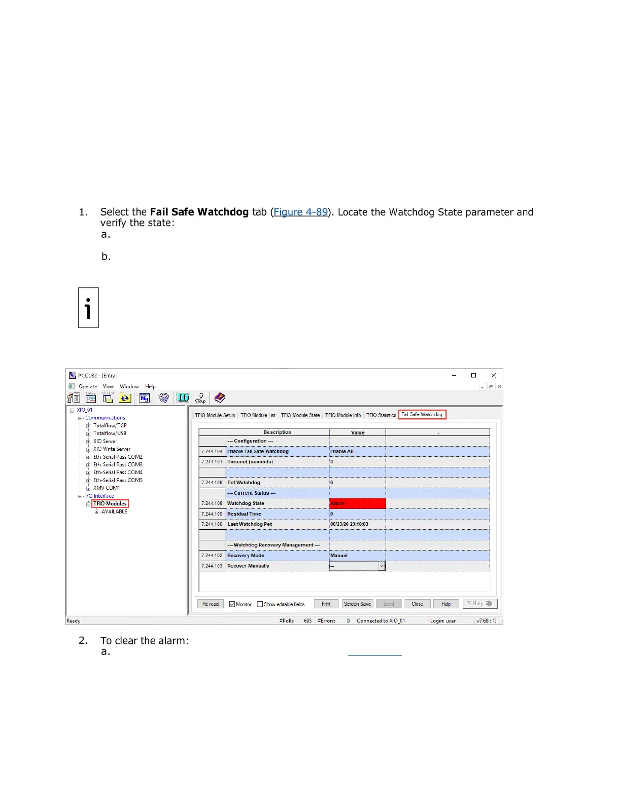 4.9.4 Clear the Fail Safe Watchdog alarm (remote TFIO control)
