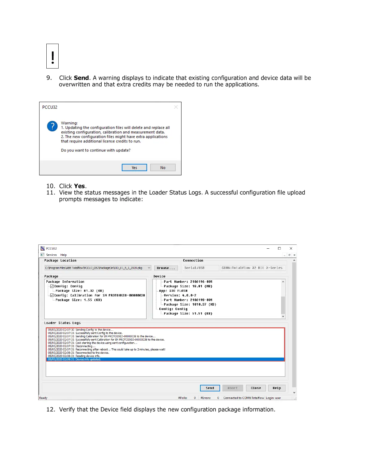 Successful completion of the configuration file update displays the message “Device info updated.”