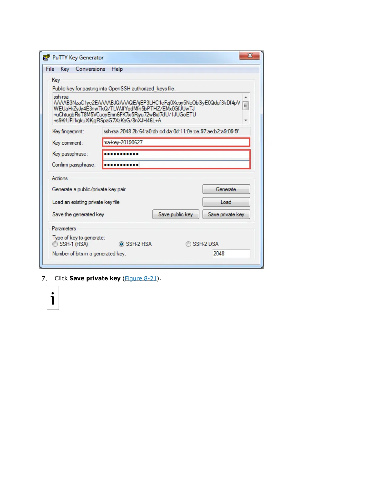 Figure 8-20: New private key comment and and passphrase