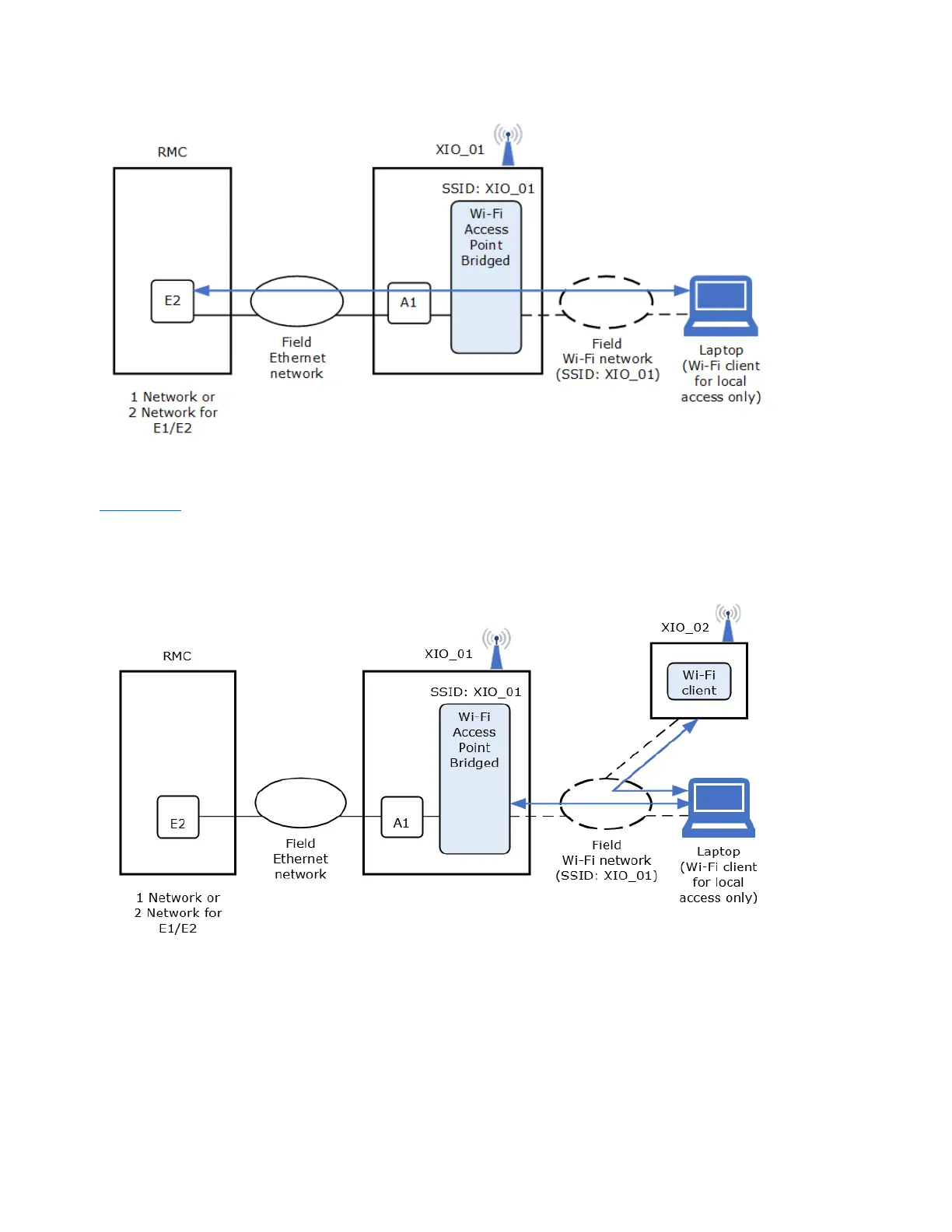 XIO in access point bridge mode (XIO_01). See the blue flow lines from the laptop to XIO_01 and XIO_02.