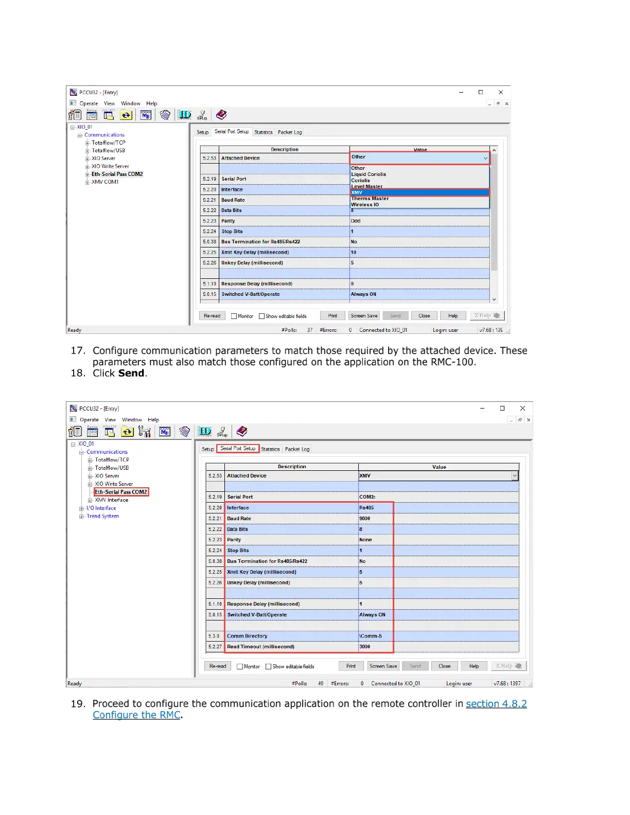 Figure 4-65: Configure XIO COM port communication values (Default values for the XMV)