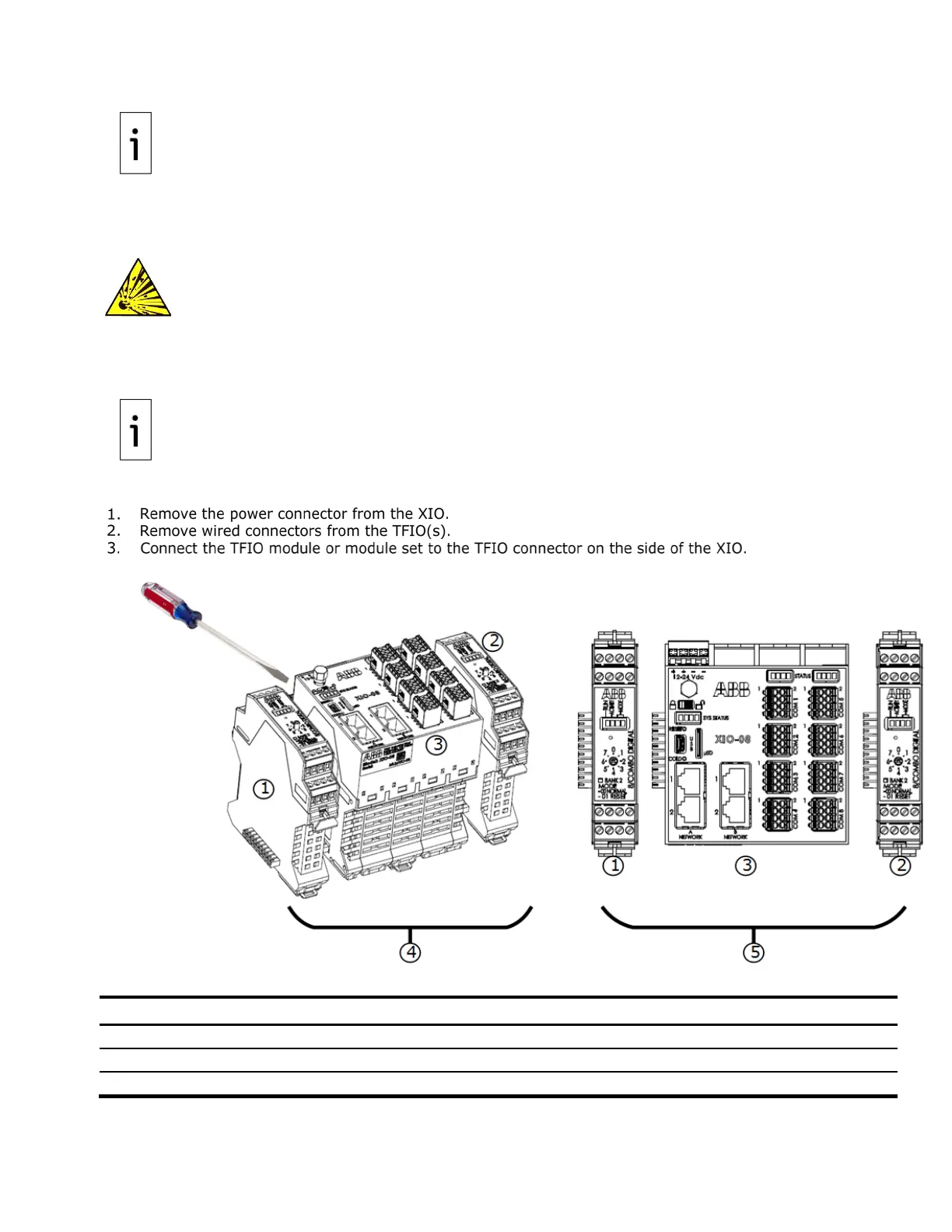 without removal of wiring. Always remove the wired connectors attached to the TFIO modules
