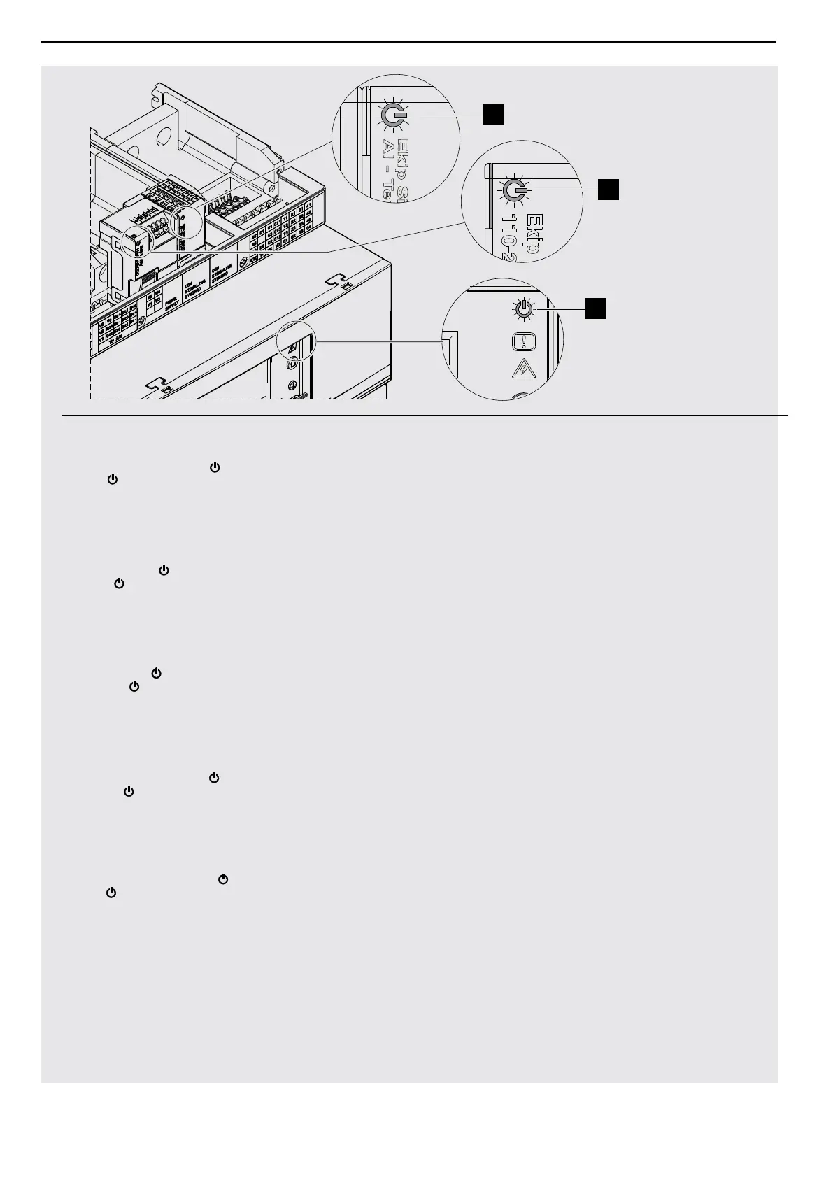 - Verificare l’accensione dei LED sul modulo (1), sull’Ekip Supply (2) e sullo sganciatore (3)