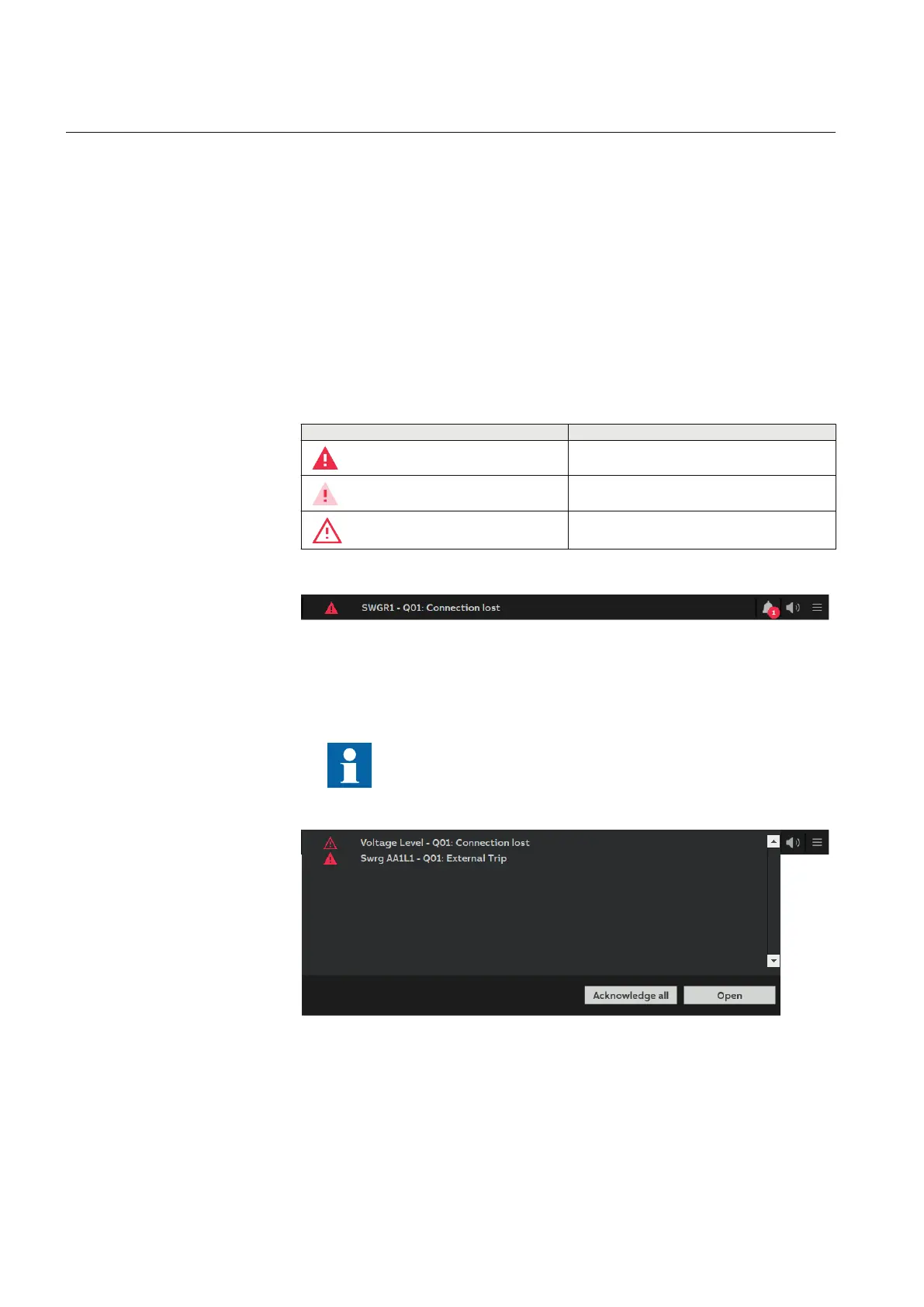2. In the alarm list, click Acknowledge all to clear all alarms or Open to open the