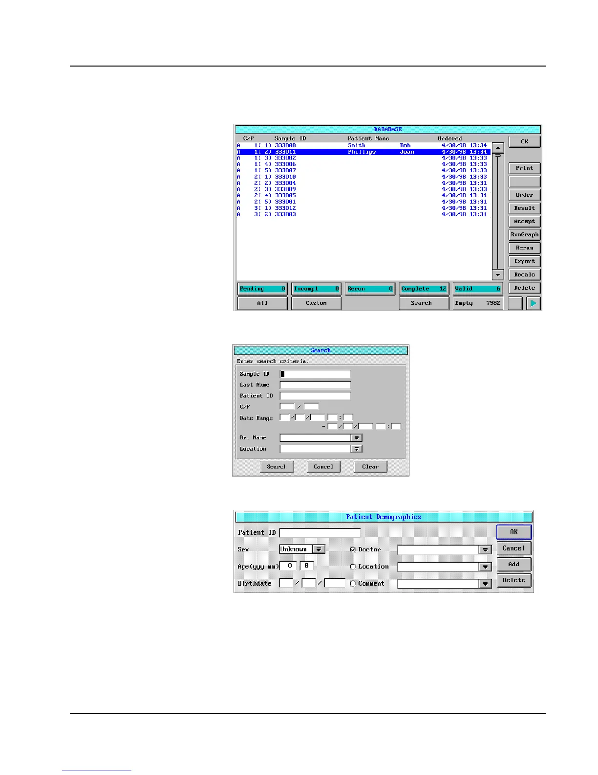 Abbott AEROSET - DATABASE Screen; Search Dialog Window; Patient Demographics Dialog Window