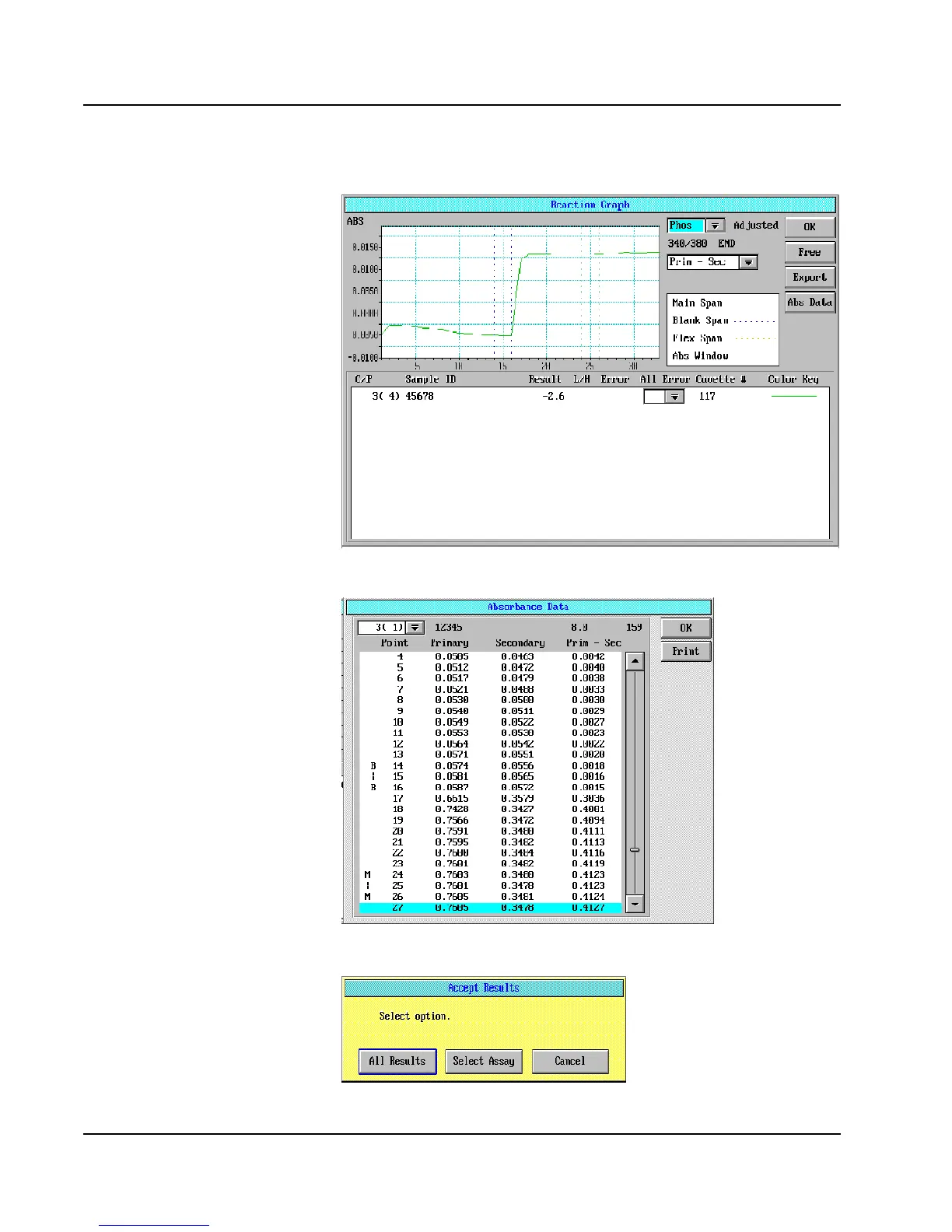 Abbott AEROSET - Absorbance Data Screen; DATABASE Screen, Accept Results Dialog Window; Reaction Graph Screen-End-Point Assay